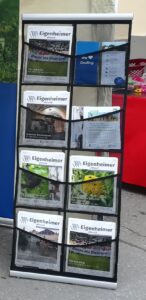 | Prospektständer ▪ Prospektständer für Messen, Präsentationen usw. ▪ geeignet für Broschüren, Prospektblätter, Kataloge ▪ 8 Netztaschen für DIN A4-Formate ▪ zusammenrollbar ▪ Netztaschen aus Textilgewebe ▪ 2 Aluminium-Klemmschienen sowie eine dreiteilige Stange ▪ schneller, einfacher Aufbau ▪ Größe (B x H x T): 51 x 140 x 38,5 cm ▪ Gewicht: 2,3 kg (ohne Medien) | ![]() | freiwillige Spende | Herr Marx, Grafing |
